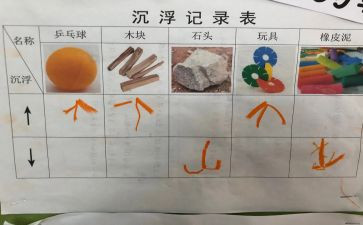 先记好的幼儿将记录的结果与自己的预测进行比较,教师帮助幼儿整理对物体沉浮现象的认识。